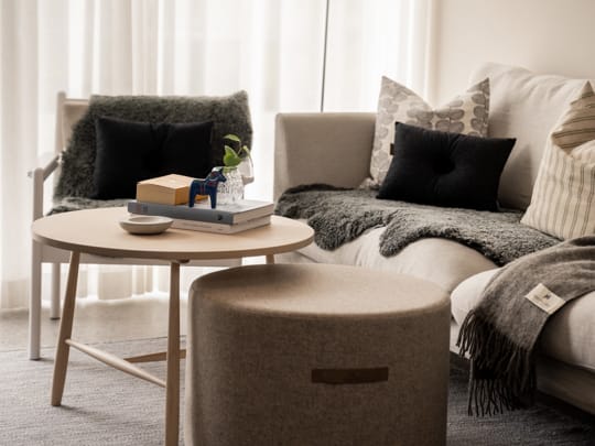 Når du velger gulvteppe til sofagruppen, bør det være minst like bredt som sofaen din, men vi anbefaler at teppet er bredere enn sofaen for en mer hjemmekoselig følelse. Legg teppet litt under sofaen for å holde det på plass, men også for å skape et mer komplekst uttrykk. Husk også å velge et teppe som er litt større hvis du har lenestoler eller en hjørnesofa, for å ramme inn hele møbelet.