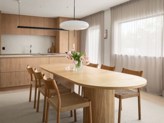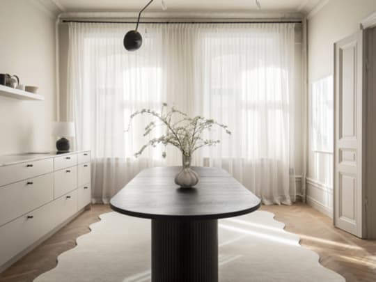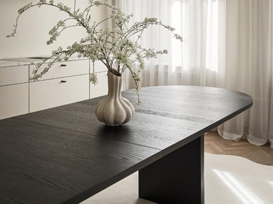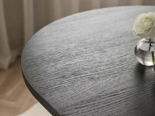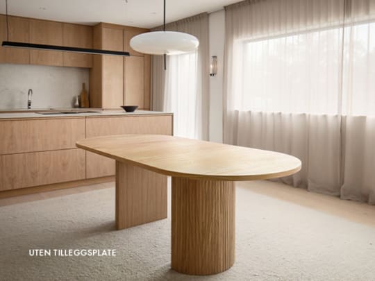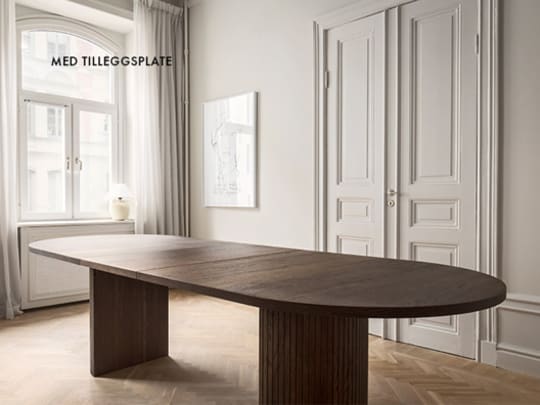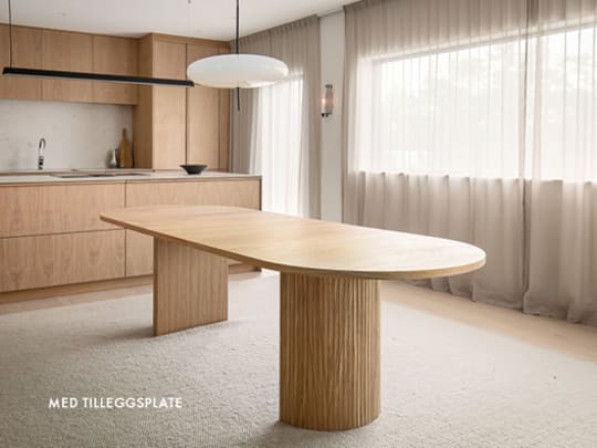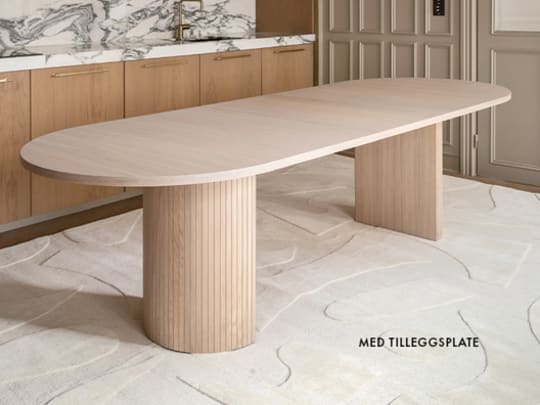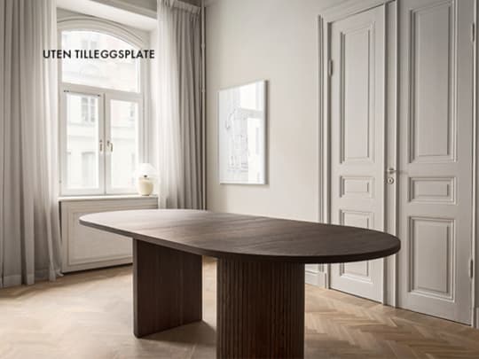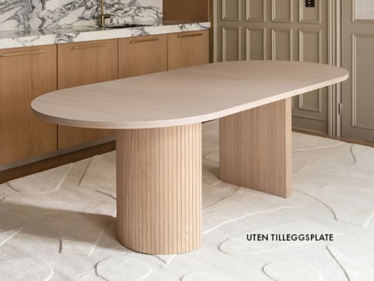 Stilig, ovalt bord med halvmåneformede piedestaler. Bordet har en toppplate i eikfinér og føttene er panelbekledt med eikfinér med en MDF-ramme. En møbel som passer godt hjemme hos de aller fleste. Kombiner med noen stilige spisestoler for et komplett utseende. Bordet kan forlenges med medfølgende tilleggsplate.