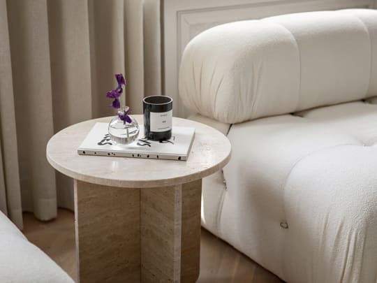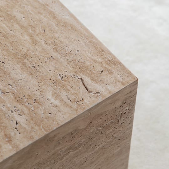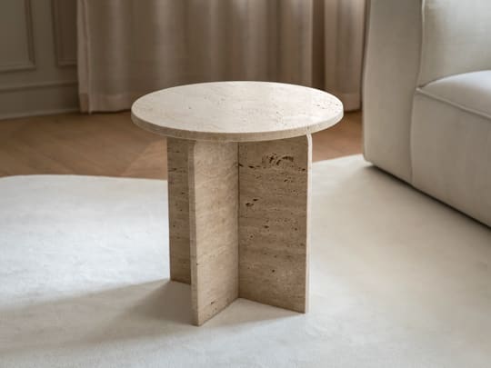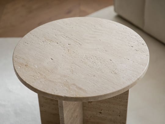 Travis er et imponerende sidebord i vakker, solid travertinstein. Bordet har en rund form med myke kanter og hjørner. Det hviler på en plussformet fot som gir bordet et mer interessant uttrykk. Det vakre travertinmaterialet skifter i nyanser av beige, sand og naturhvit, noe som gjør hvert bord unikt. Kombiner det gjerne med sofabordet fra samme serie.