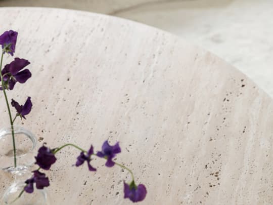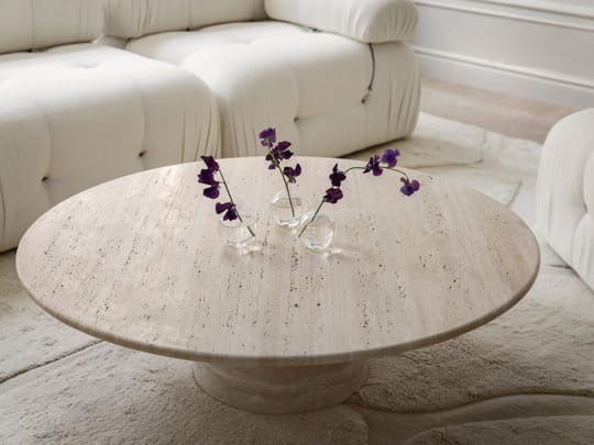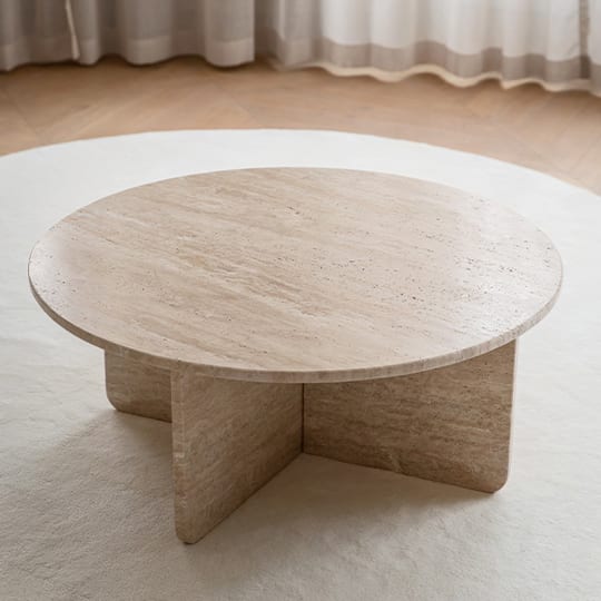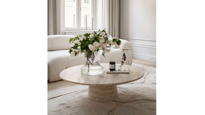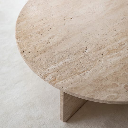 Travis er et imponerende sofabord i vakker, solid travertinstein. Bordet har en rund form med myke kanter og hjørner. Det hviler på en plussformet fot som gir bordet et mer interessant uttrykk. Det vakre travertinmaterialet skifter i nyanser av beige, sand og naturhvit, noe som gjør hvert bord unikt. Kombiner det gjerne med sidebordet fra samme serie.