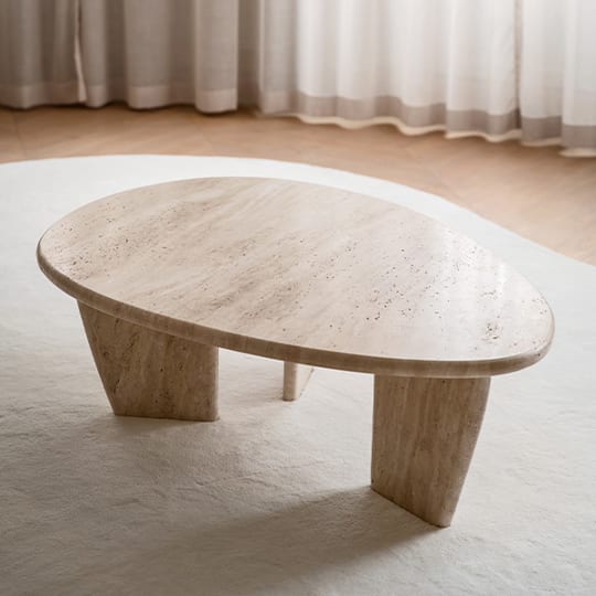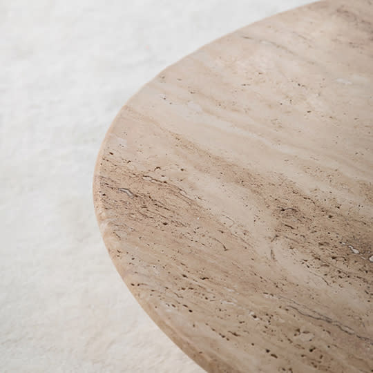 Francis er et imponerende sofabord i vakker, solid travertinstein. Bordet har en uregelmessig, avlang form med avrundede hjørner. Det hviler på tre ben plassert i forskjellige vinkler, noe som skaper en tiltalende kontrast til bordplaten. Det vakre travertinmaterialet skifter i nyanser av beige, sand og naturhvit, noe som gjør hvert bord unikt og kan oppleves forskjellig avhengig av lys og omgivelser.
