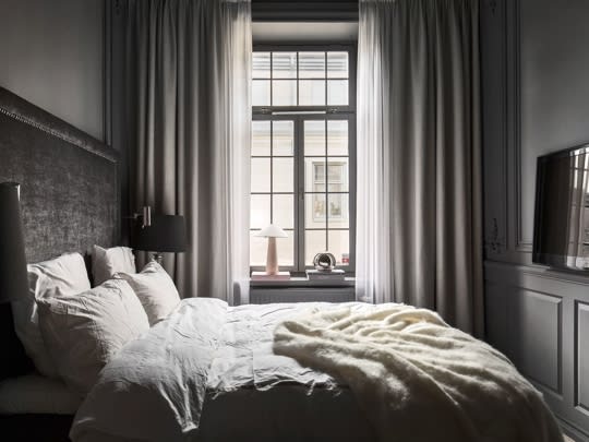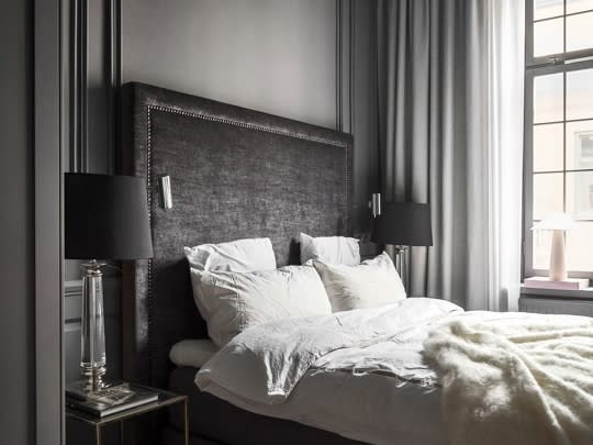 På det magiske gjesterommet hadde noen ønsket å flytte inn. Med en mørkegrå farge malt på både tak og vegger, heftige stukkatur og mye tekstil, får vi også den ettertraktede hotellfølelsen her. Det vakre teppet på bildet er laget av den mykeste mohairull og er like hyggelig å kaste litt uforsiktig på sengen som å kose seg med i sofaen. I det store vinduet har Louise stylet med vår staselige bordlampe Triangle Cone. En tidløs lampe som passer inn i ethvert hjem.