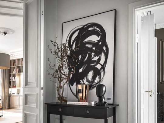 Gjennomgangen til stuen er i motsetning til de andre rommene i leiligheten i en lys farge. Det minimalistiske, men likevel uttrykksfulle Doodle-bildet, kommer i tre varianter og er en illustrasjon av Day Homes Creative Director Marianne Brandi. På gulvet er det mykeste teppet i ull som det er deilig å gå barbeint på. Granada er et fantastisk tykt, melert teppe med mye struktur og karakter. Louise har virkelig funnet en rød tråd i hjemmet sitt, og alt interiøret går sammen i magisk harmoni.