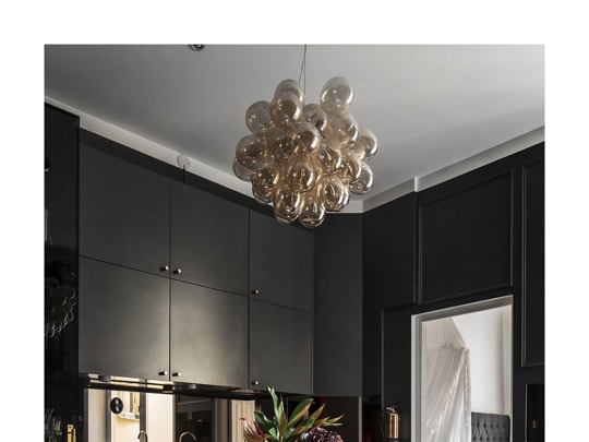 I den store og luftige leiligheten er det plass til to spiseplasser. Den større passer i stuen hvor du også kan se den berømte bokhyllen som Louise selv har designet. Den andre spiseplassen er på kjøkkenet der familien ofte sitter sammen og spiser. Den eksklusive Gross-taklampen henger fra taket og passer perfekt inn hos Louise med sitt unike design. Lampen består av 37 klare glasskupler med en nydelig finish.