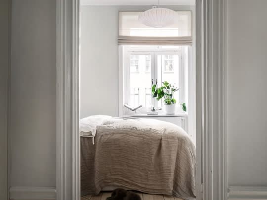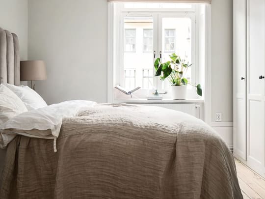 Med et glimt inn på soverommet ser vi igjen myke farger i beige og nydelige tekstiler i lin. Hannelin-sengeteppet er veldig populært og passer i alle hjem med sin tidløse og pene design. Ellipse taklampe er også en stor favoritt og er fantastisk vakker i sin ovale form og jerseystoff.