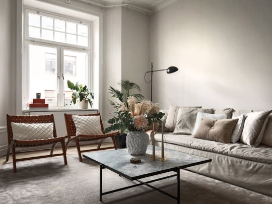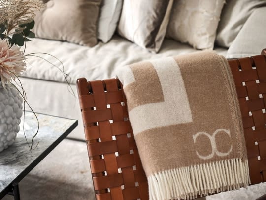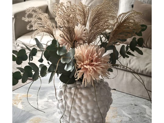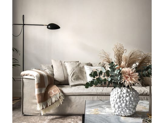 I følge Sanne er stuen hjertet i hjemmet. Det er en veldig sosial og åpen plass hvor både familie og venner samles. Det koselige teppet på bildet er laget av den mykeste New Zealand-ullen og er deilig å varme seg i når du kryper opp i sofaen. Med et trendy og harmonisk uttrykk, passer Celeste-vasen magisk pent inn i det indre av Sanne hjem. Med en stor bukett i naturlige farger vil den være helt perfekt.