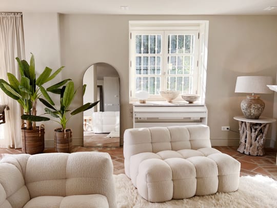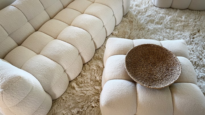 Billie-sofaen ble det opplagte valget med sitt myke teddystoff, utrolig behagelige og sjenerøse størrelse. Fluffy-teppet i flokati-ull føltes også plettfritt med sin lange og koselige luv.