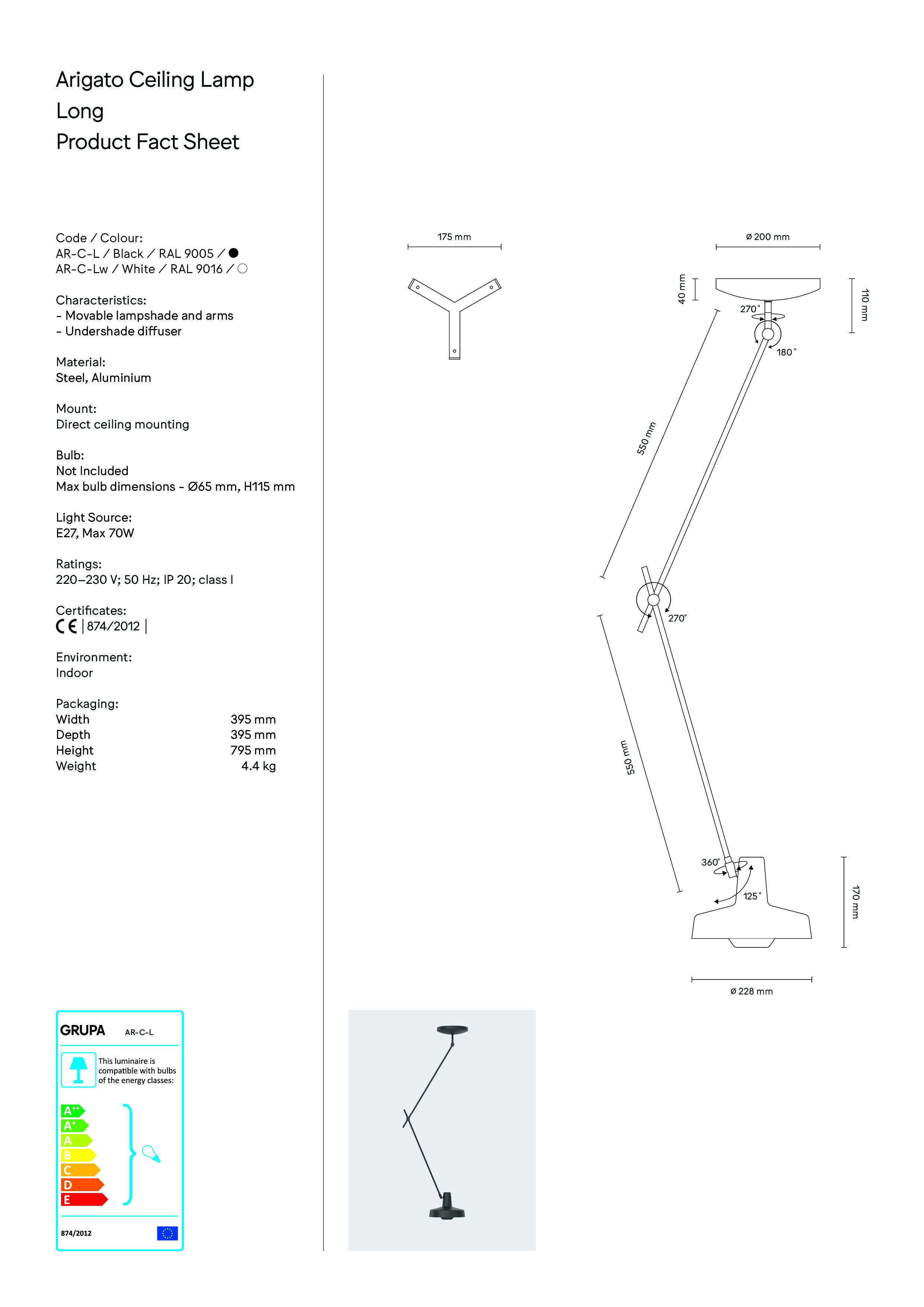 Taklampen Arigato L med sine lange armer har en funksjonell og innovativ design. De justerbare leddene gjør det enkelt å tilpasse lampens posisjon, mens skjermen kan rotere 360 grader for å rette lyset i ulike retninger. Taklampen er ideell over kjøkkenbordet eller skrivebordet, der fleksibel belysning er nødvendig, samt i gangen der den fungerer både som en stilig interiørdetalj og en effektiv lyskilde.