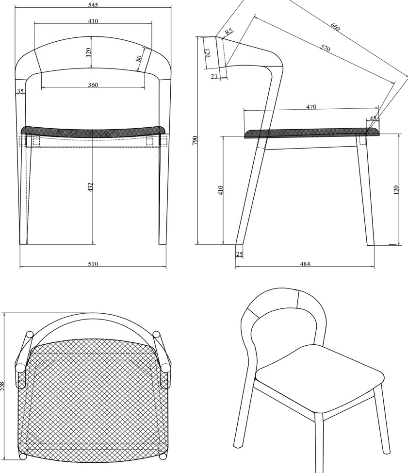 Stolen har en mykt formet rygg i ett stykke som gir naturlig støtte til ryggen og skaper en innbydende silhuett. Det polstrede setet er trukket med et lett, vevd tekstil i en hvit tone, som gir både komfort og en følelse av letthet. Den avsmalnede formen på bena og den velbalanserte konstruksjonen gir stolen et luftig, men stabilt uttrykk.