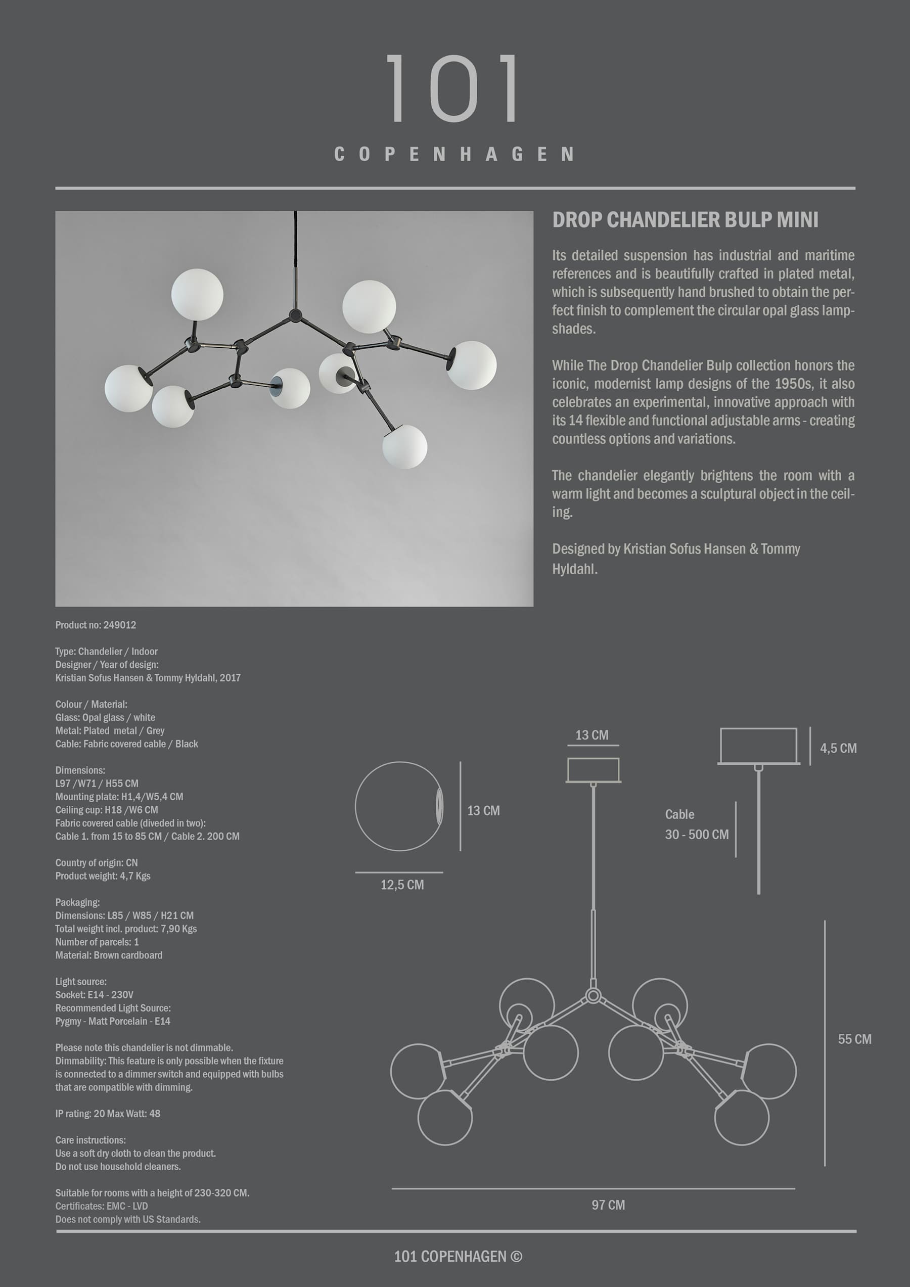 Den detaljrike opphenget har industrielle og maritime referanser og er vakkert laget i belagt metall, som deretter er børstet for hånd for å oppnå en perfekt finish som kompletterer de sirkulære opal glasskjermene. Drop Chandelier Bulp-kolleksjonen hyller de ikoniske, modernistiske lampedesignene fra 1950-tallet, men feirer også en eksperimentell, innovativ ånd med sine 14 fleksible og funksjonelt justerbare armer, som skaper utallige muligheter og varianter. Lysekrone lyser elegant opp rommet med et varmt lys og blir et skulpturelt objekt i taket.