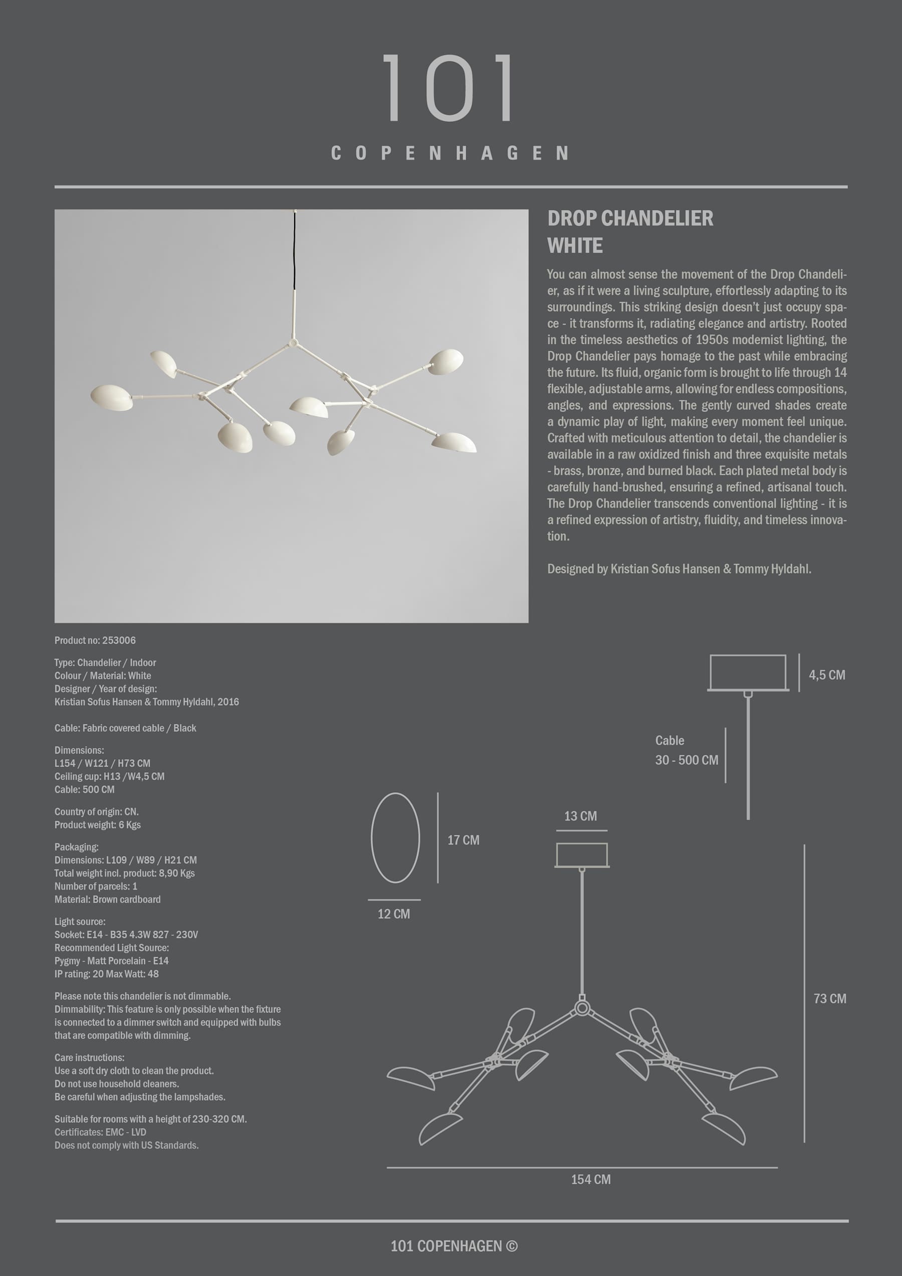 Du kan nesten føle bevegelsen til Drop Chandelier. Som en frittflytende skulptur tar den opp plass. Drop Chandelier-kolleksjonen hyller modernistiske lampedesign fra 1950-tallet, men feirer også en eksperimentell og innovativ tilnærming med sine mykt buede skjermer og 14 fleksible, funksjonelle justerbare armer – noe som skaper utallige muligheter, variasjoner og vinkler.